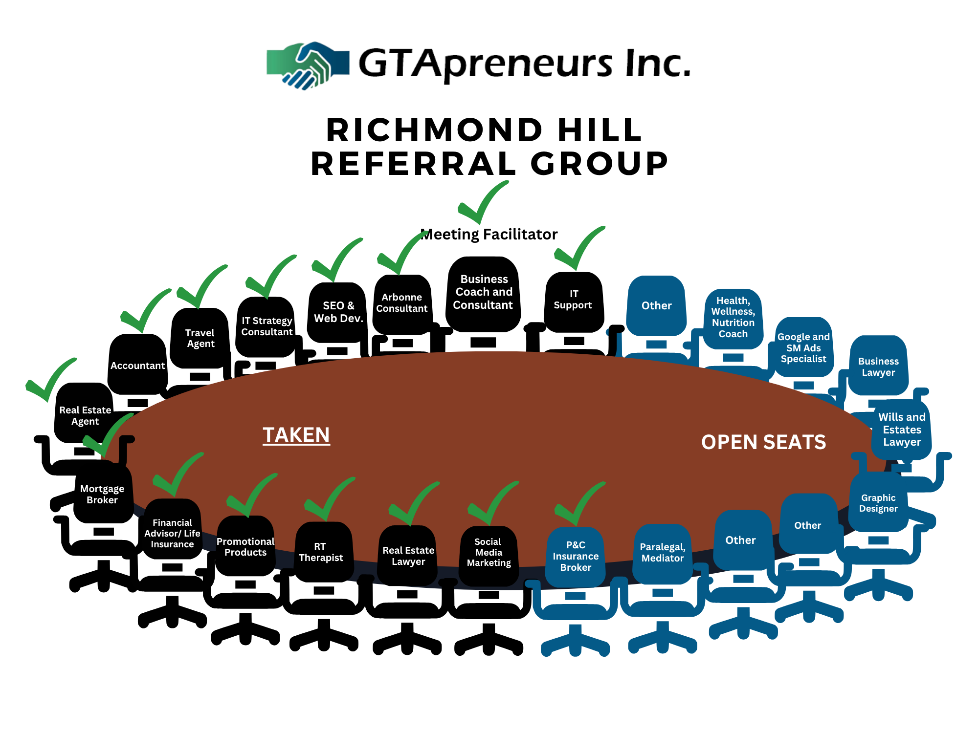 “Taken” means a member is currently occupying that seat. “Open Seats” means we have an opening for that profession, so if you represent that profession, you may be able to join. Just send us a message below, so we can reach out to book a video call with you to learn about your business and tell you more about how our groups work.